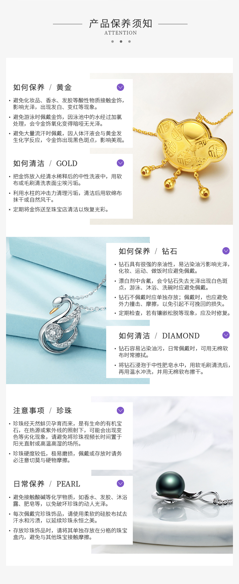 铂金是最耐磨的金属,若出现刮花或损坏时,只要把首饰拿到珠宝店打磨、加金修补, 首饰便能恢复昔日光彩,有划痕应尽快处理修补。存放铂金首饰应选用有软垫或廘皮的 首饰盒单独存放,以减少因碰撞造成的金属移位机率。